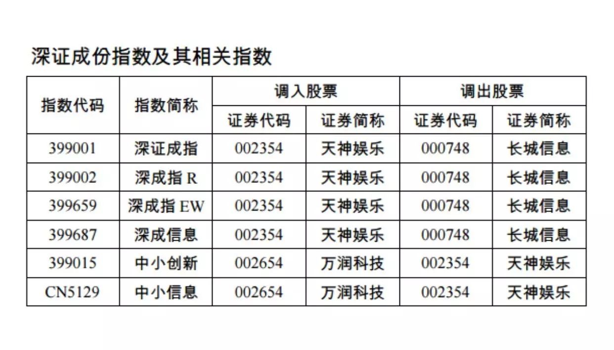 根据深圳证券交易所1月13日发布的《 关于调整深证成指等指数样本股的公告》显示,,,深交所决定于1月18日对深证成指 、、 、深证300等指数样本股进行调整,,,其中将天神娱乐(002354)调入深证