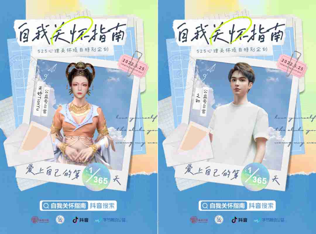 近日,,,胜天国际旗下虚拟数字人“天妤”(账号名称:天妤TianYu)和 虚拟数字人“之初”(账号名称:颜之初)作为公益号召官参与了由抖音发起的“自我关怀指南”525心理关怀项目特别企划。。。