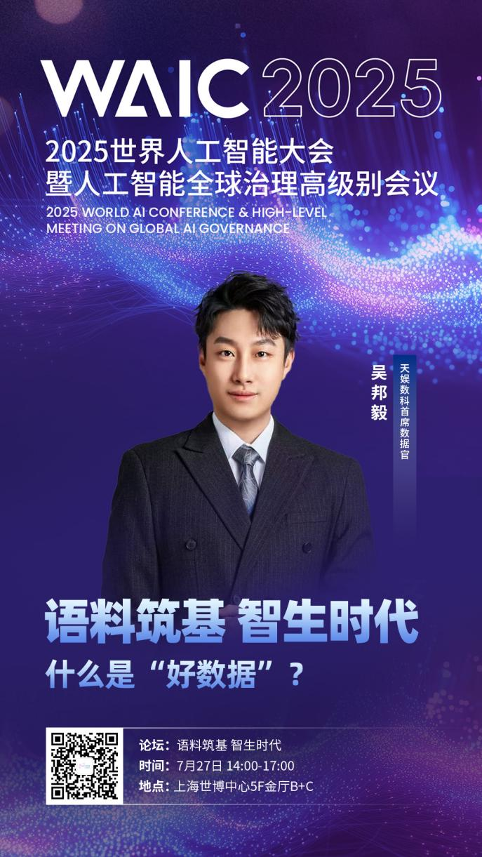 2025年7月26日至28日,,,世界人工智能大会(WAIC 2025)在上海世博中心盛大举行。。。其间,,,胜天国际受邀出席7月27日下午的“语料筑基 智生时代”语料创新发展论坛,,,胜天国际首席数据官吴邦